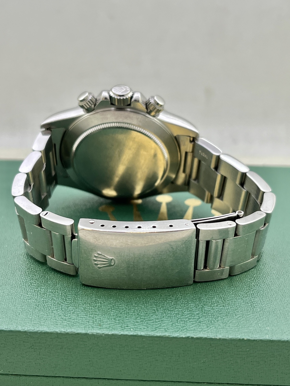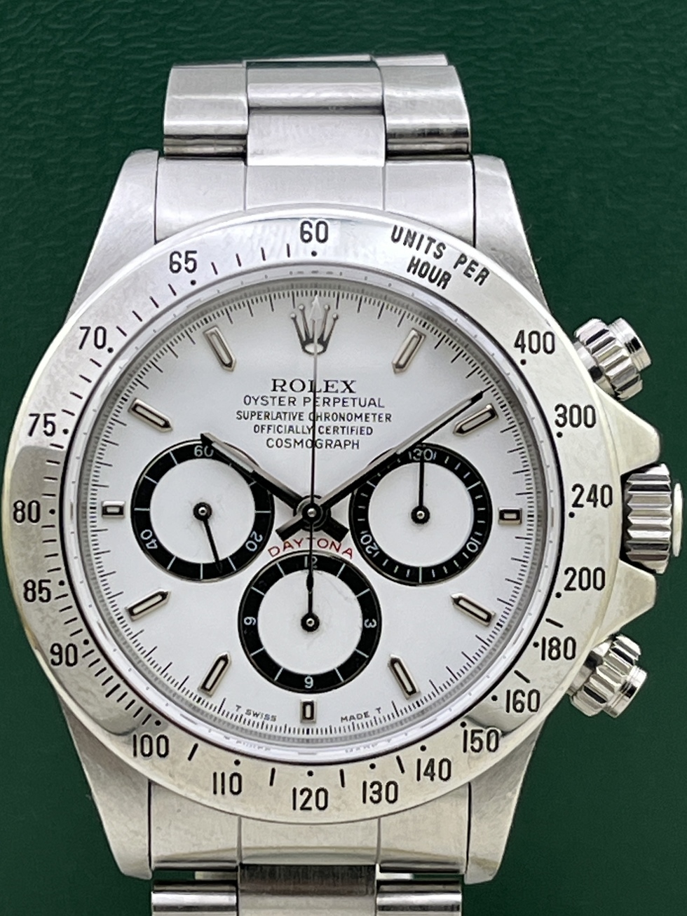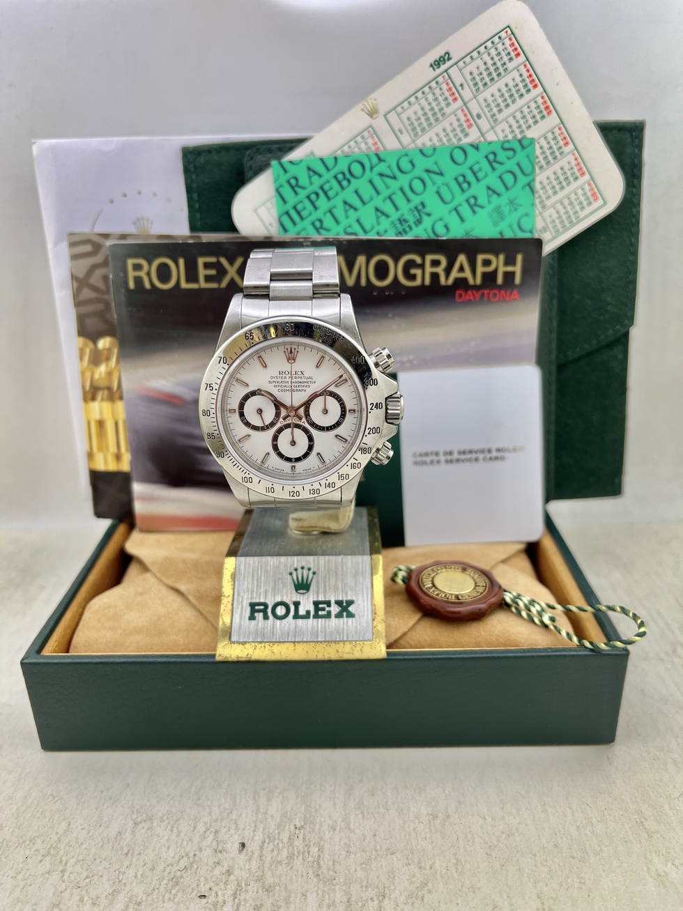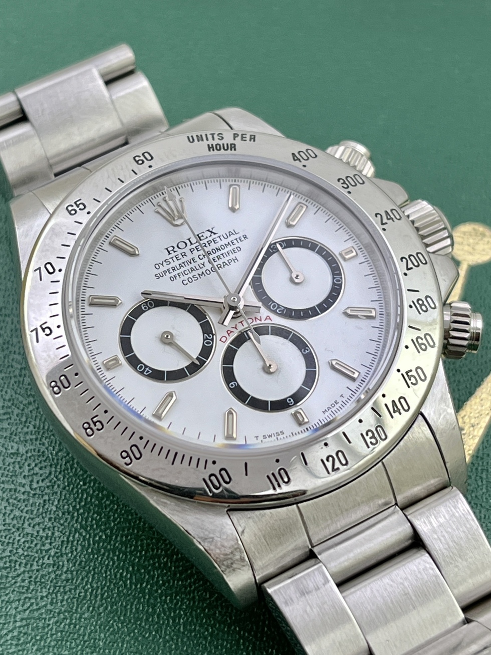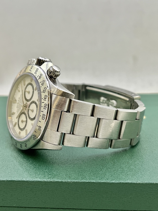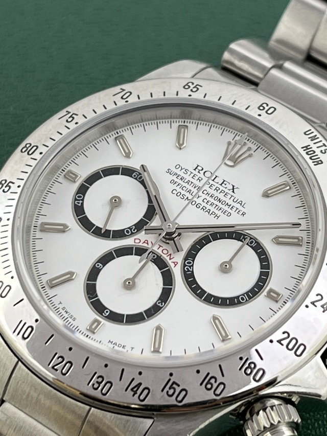 | 91-92年辺り製造 N4品番 DAYTONA Ref.16520 Zenith SS の登場です。 人気のホワイトダイアルでN4品番ですのでInverted 6(逆6)となります。 コンディションも良く傷や劣化も見当たりません。 文字盤、針はもちろん夜光共にオリジナルです。 ケースコンディションも良くブレスは当時のオリジナルスイス製シングルRef.78360FF503 クラスプ刻印P11 をキープしており伸びも少なく良い状態です。 ベゼルも傷等少なく良好だと思います。 日本ROLEXにて正規OH済で保証期間内となりますのでご安心頂けるかと思います。 16520の文字盤はPorcelain、段落ち、4LINE、、Normal6、Brown、Patritzziそして今回のInverted6とバリエーション豊富なモデルですので非常に人気がありコレクションにも最適かと思います。 今後の高騰が楽しみな価値ある一本である事は間違いありませんね。 是非、この機会にコレクションに加えてみてはいかがでしょうか? |