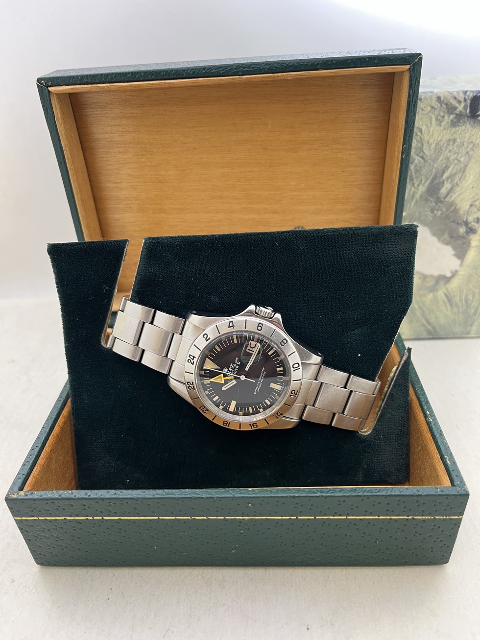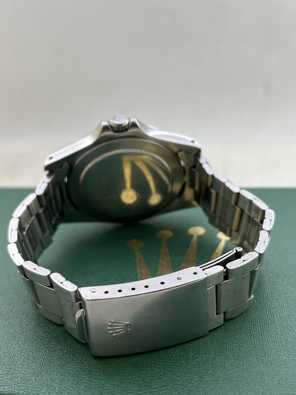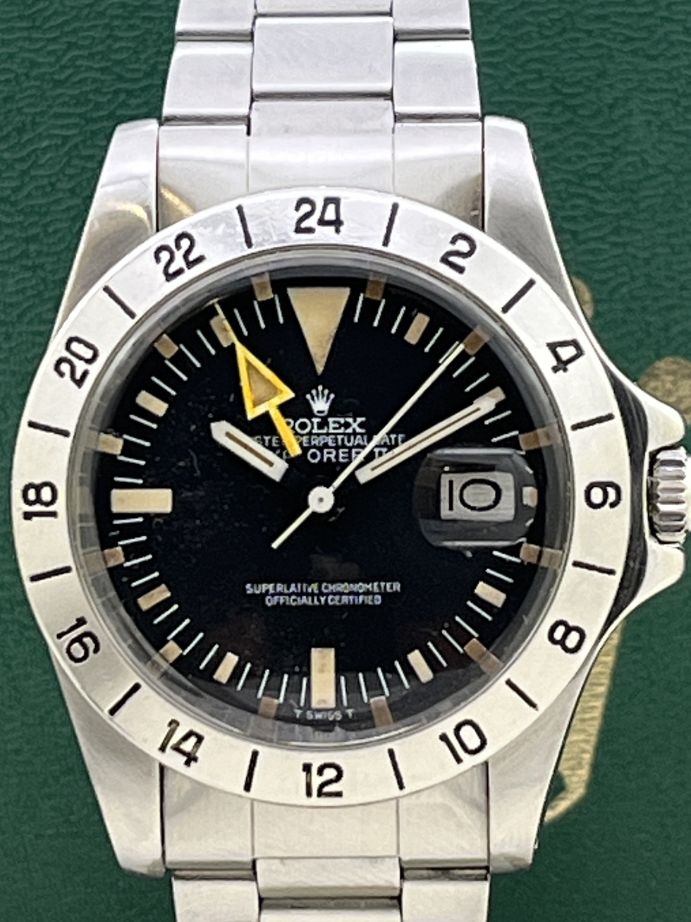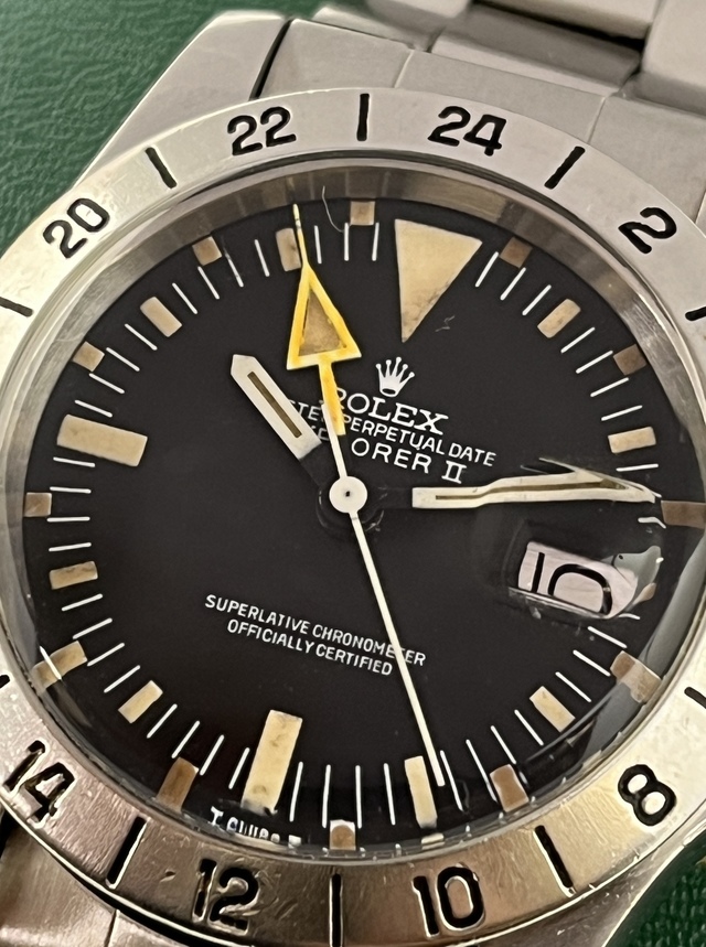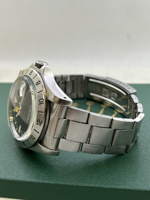 | EXPLORER-2 ファーストモデル Ref.1655 MK-2 Dial MK-2 Bezel の登場です。 77年頃製ですのでRef.1655の中でも中期ロットかと思います。 文字盤はMK-2でやや太字のMK-2ベゼルとのコンビネーションがかなりカッコ良いですね。 インデックスと針の夜光も所々経年劣化による色ムラが見受けられるもののほぼ同色でEX-2らしい無骨さが際立っております。 オーナー様の好みでストレート針が装着されております。 ケースはラグも太くコンディション抜群だと思います。 ブレスレットはRef.7836FF258を装備し伸びも少なく良好です。 相場も高止まりの感がございますレアモデル 是非、お探しの方この機会をお見逃しなく!! |