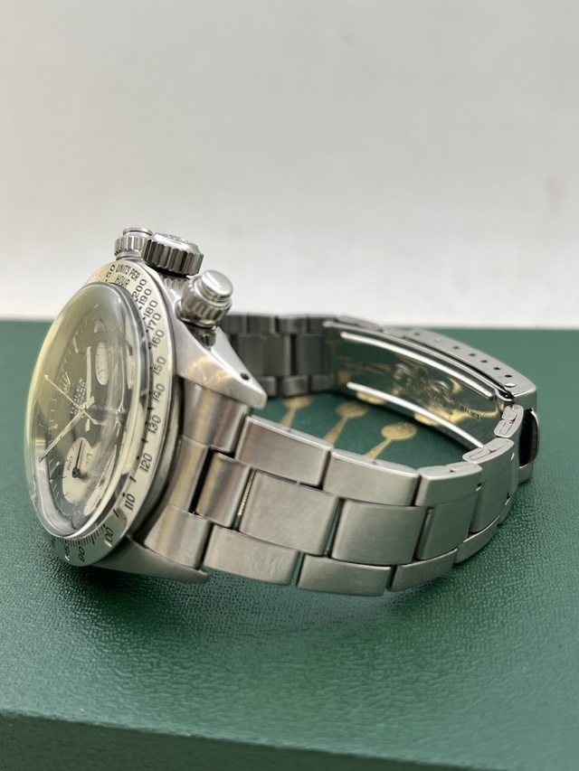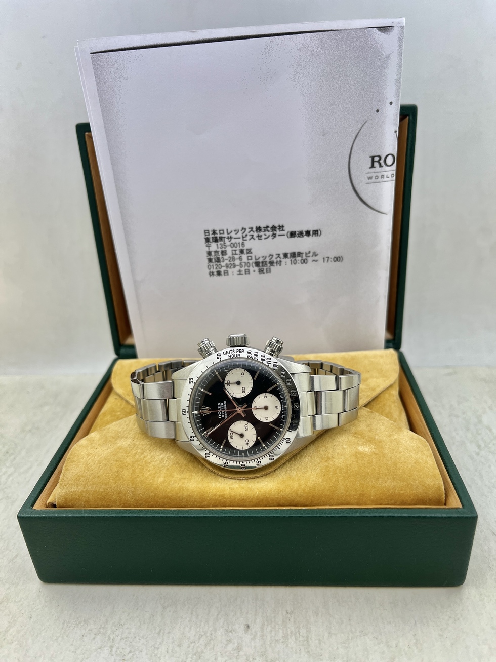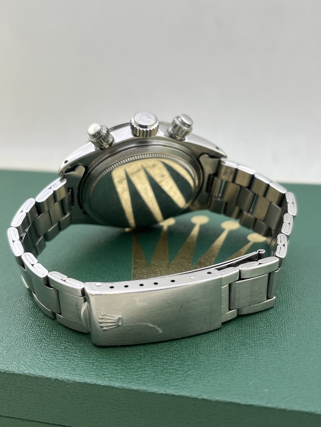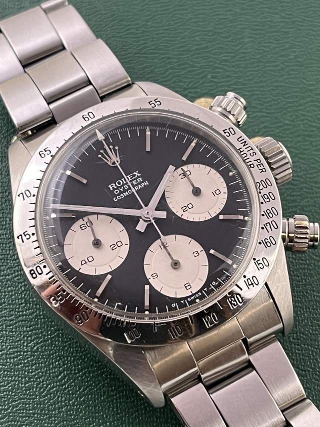 | 不動の人気モデルDAYTONA Ref.6265の出品です。 73年頃の個体で DAYTONA表記なし黒シグマ文字盤となります。 夜光欠落はございますが傷等なく針共にグリーンにUV反応いたしますのでトリチウムかと思います。 ケースコンディションは良好でベゼルは細かい使用傷や墨抜けは見受けられるものの丸くダレた印象はなく平な面も出ており悪くないと思います。 プッシャーは溝有りとなります。 ブレスレットは当時の4.71刻印ロールブレス Ref 7835FF557を装備し伸びも少なく良好です。 日本ROLEXにてオーバーホール(レストレーション)可能との回答を頂いた個体です。 かなりリーズナブルな価格となっております。 この機会ににいかがでしょうか? |