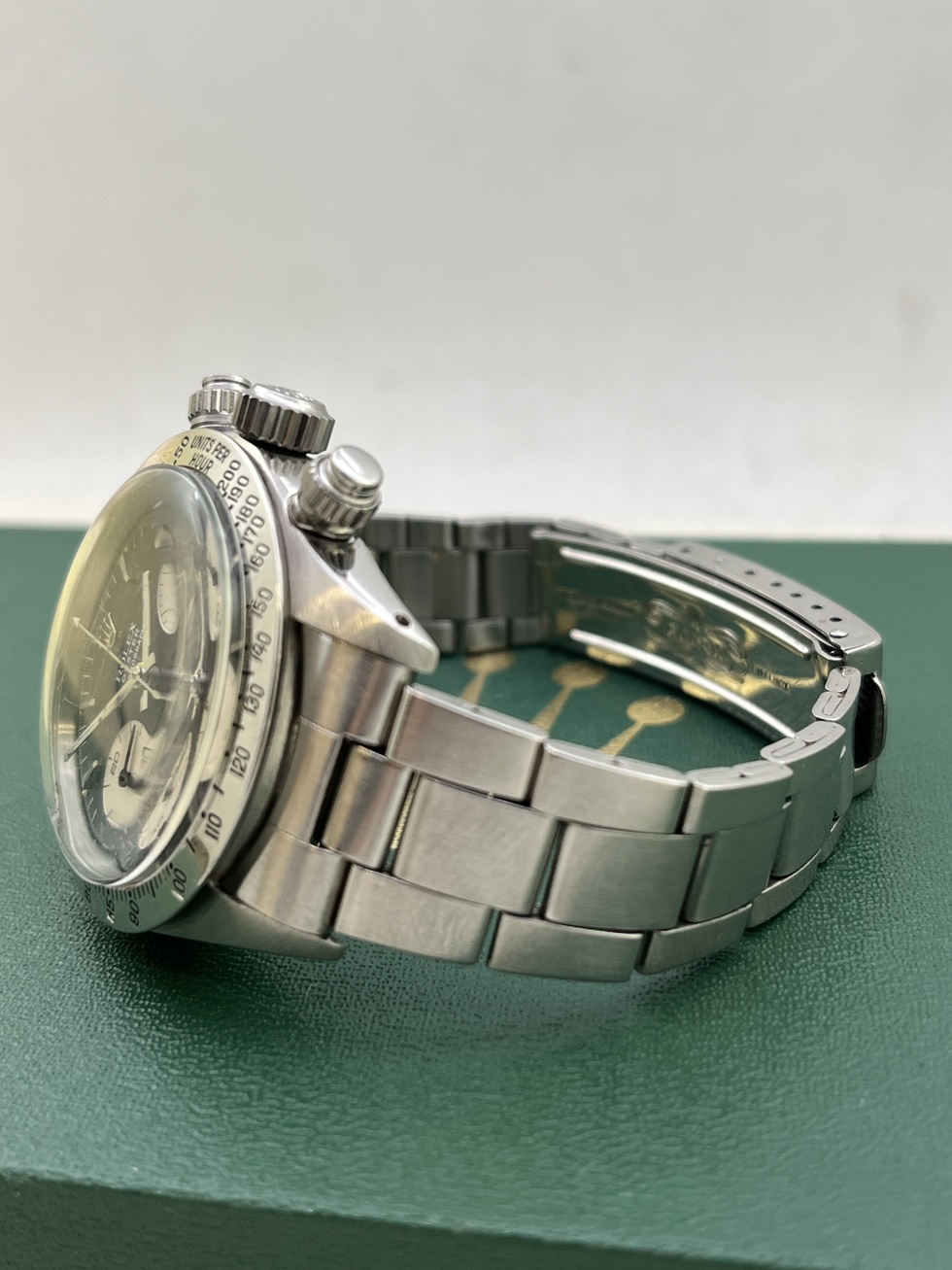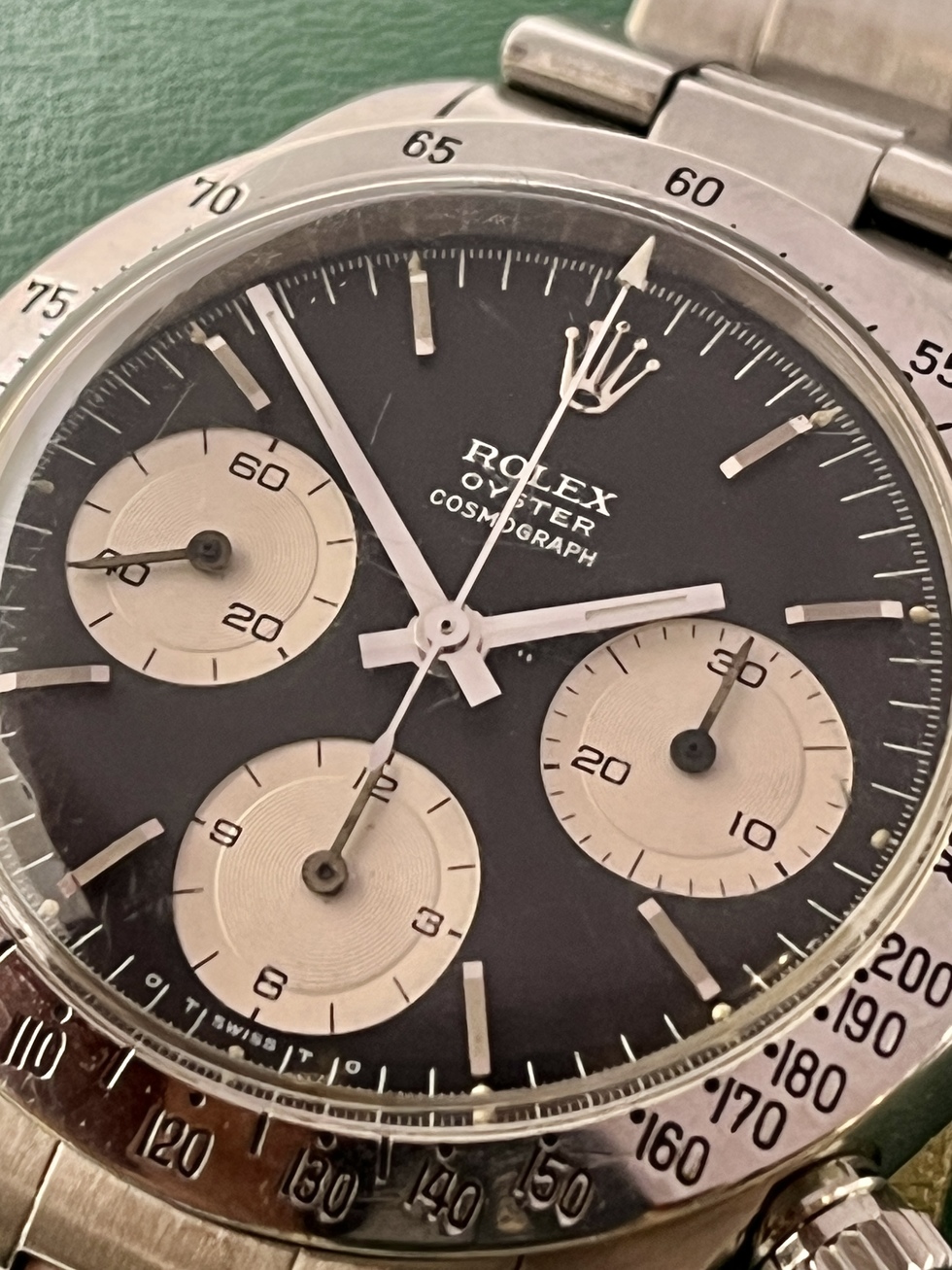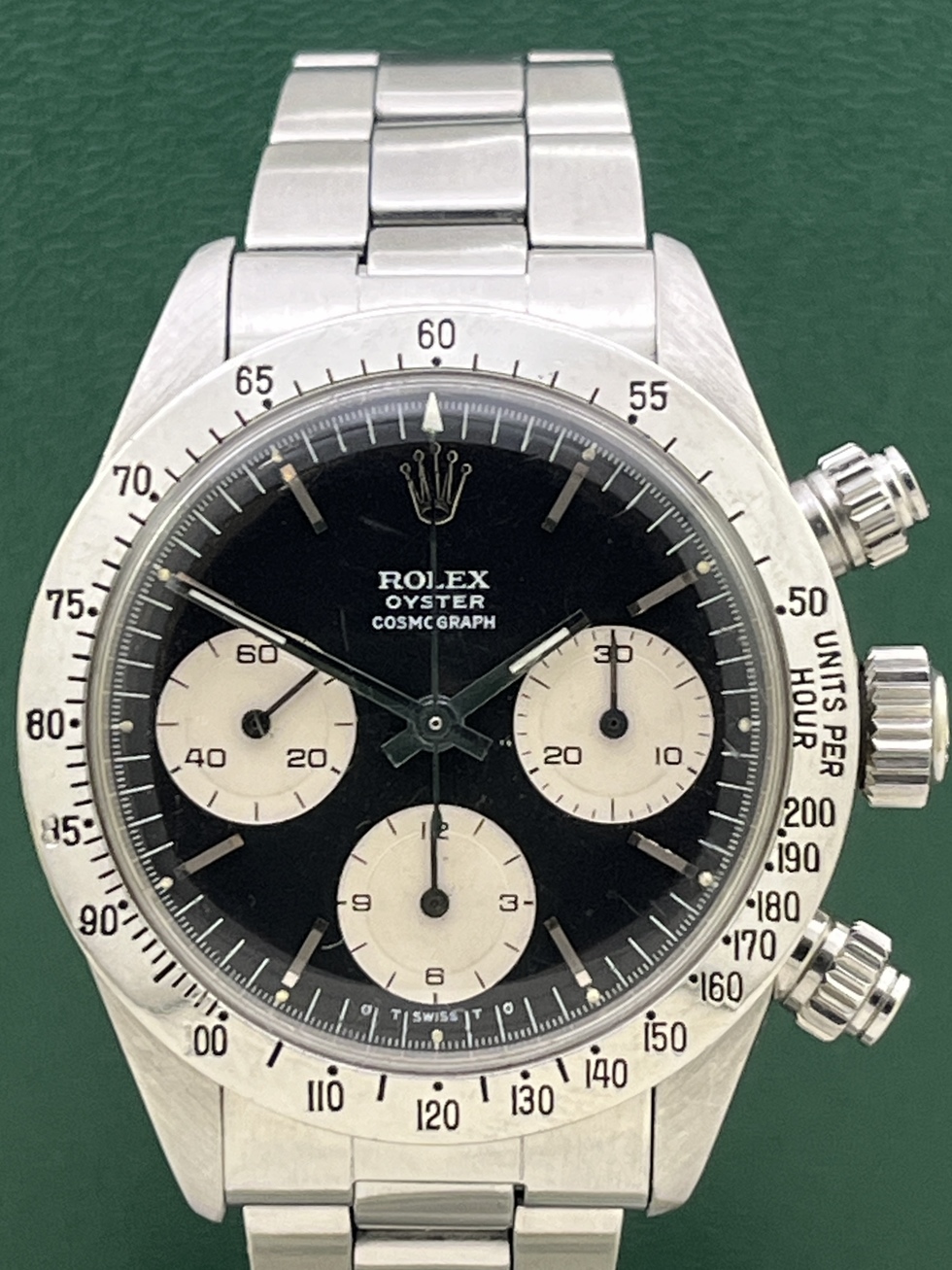 | 不動の人気モデルDAYTONA Ref.6265の出品です。 73年頃の個体で DAYTONA表記なし黒シグマ文字盤となります。 夜光欠落はございますが傷等なく針共にグリーンにUV反応いたしますのでトリチウムかと思います。 ケースコンディションは良好でベゼルは細かい使用傷や墨抜けは見受けられるものの丸くダレた印象はなく平な面も出ており悪くないと思います。 プッシャーは溝有りとなります。 ブレスレットは当時の4.71刻印ロールブレス Ref 7835FF557を装備し伸びも少なく良好です。 日本ROLEXにてオーバーホール(レストレーション)可能との回答を頂いた個体です。 かなりリーズナブルな価格となっております。 この機会ににいかがでしょうか? |