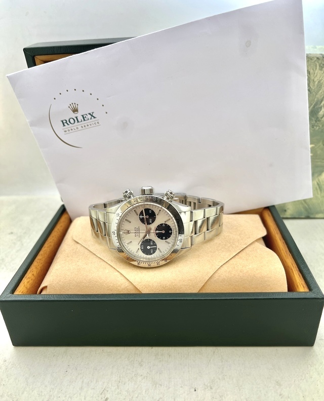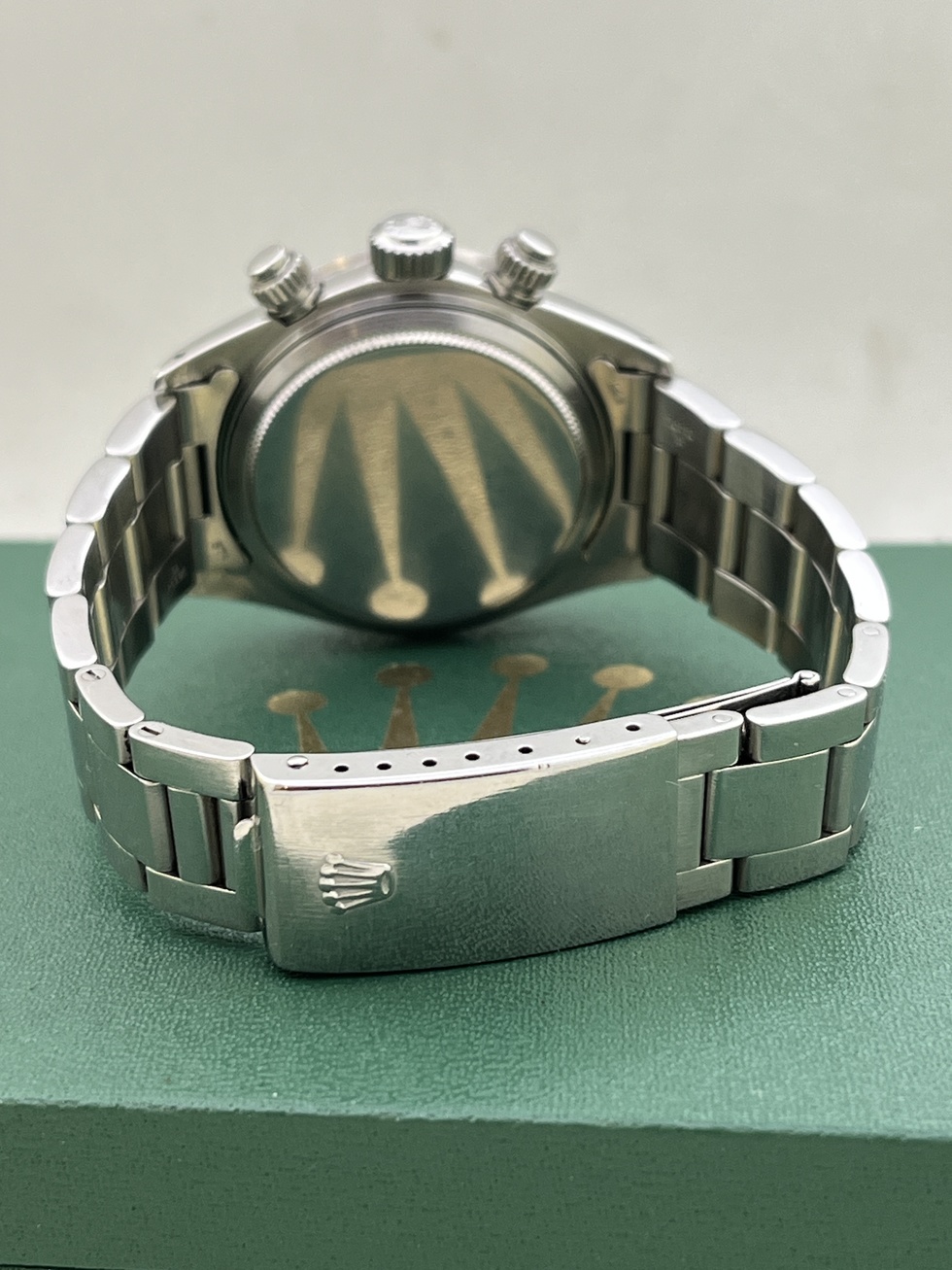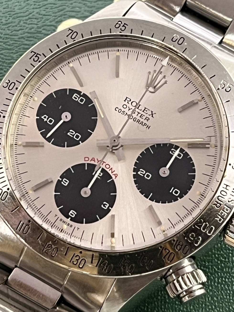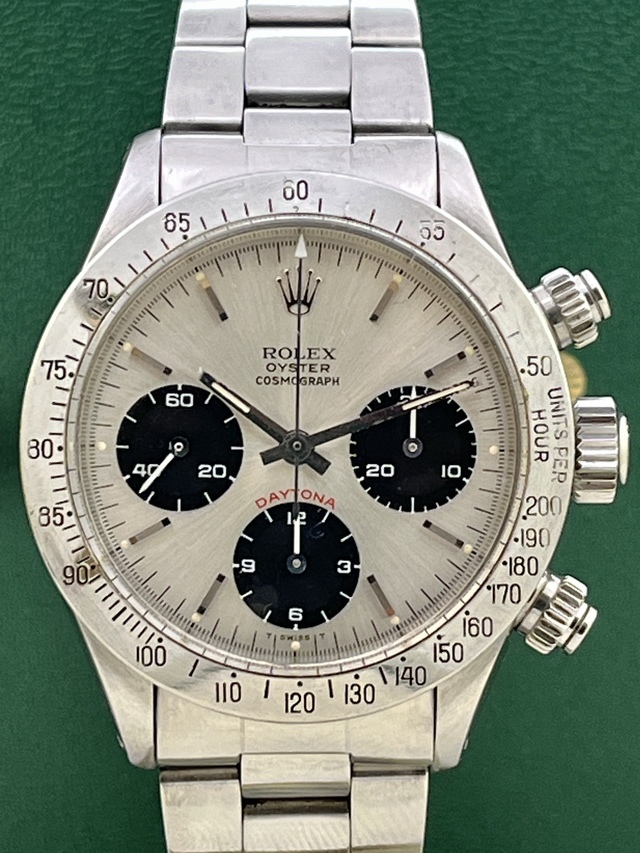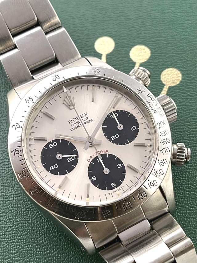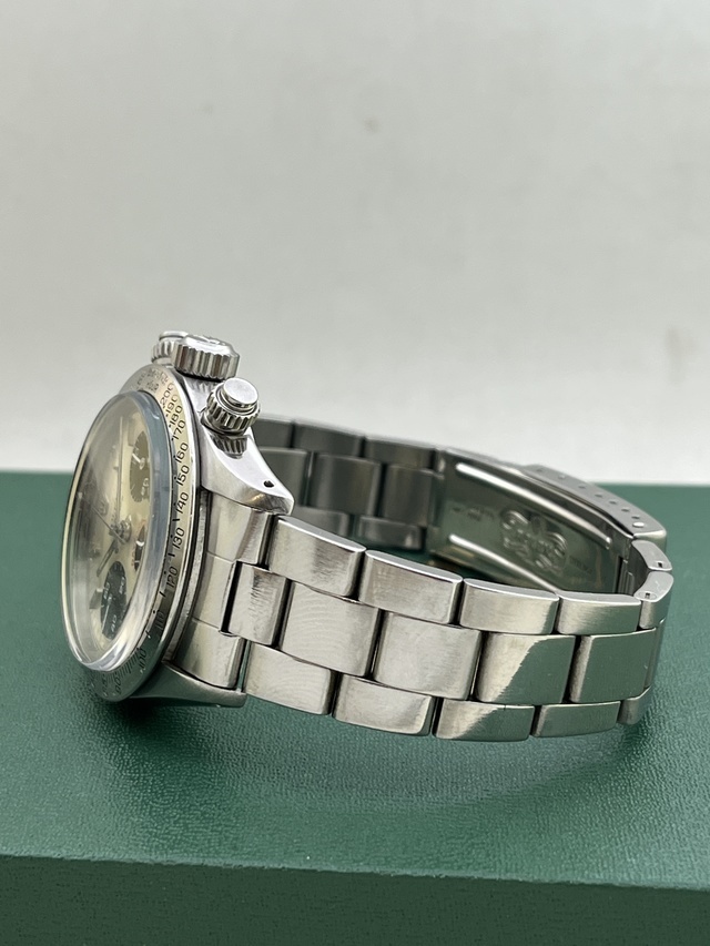 | 不動の人気モデルDAYTONA Ref.6265の出品です。 79年頃の個体でSmall DAYTONA表記文字盤となります。 夜光欠落はなく針共にグリーンにUV反応いたしますのでトリチウムかと思います。 ケースコンディションは良好でベゼルは細かい使用傷や墨抜けは見受けられるものの丸くダレた印象はなく平な面も出ており悪くないと思います。 プッシャーは溝有りとなります。 ブレスレットは当時のVC刻印ハードブレス Ref 78350FF571 を装備し伸びも少なく良好です。 かなりリーズナブルな価格となっております。 この機会ににいかがでしょうか? |