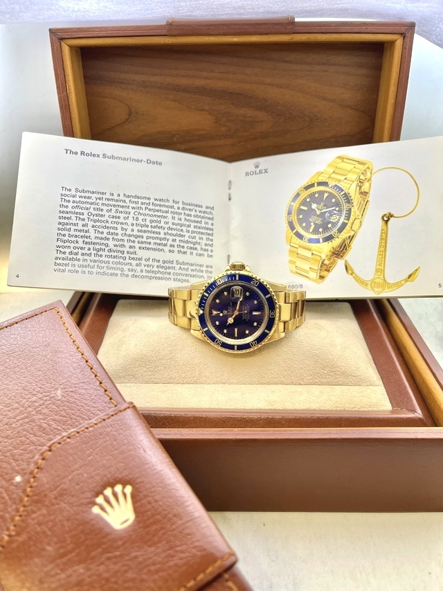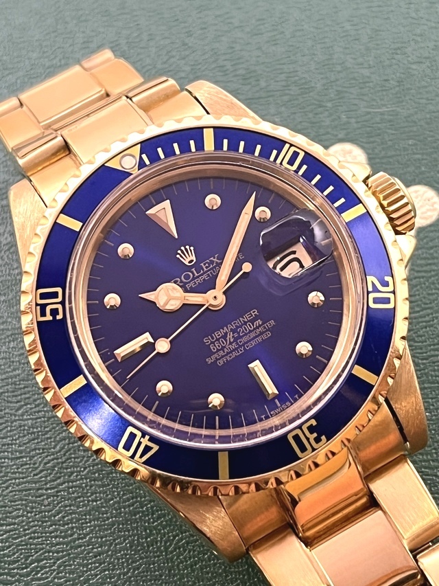 | SUBMARINER Ref.1680/8 K18YG無垢 の登場です。 文字盤は人気のフジツボ(Nipple) Dialです。 若干ブルーパープルに変色したオリジナル夜光の貴重な文字盤で針共に同じUV反応をいたします。 当時のMK-3ベゼルをキープしており深い傷なども無く良好です。 ケースコンディションに関してもオーバーポリッシュ等も見受けられずラグもしっかり太く良好だと思います。 ブレスレットはオリジナルK18YG無垢Ref.9290飛び出し王冠を装備し伸びも少なく良好です。 (クラスプ内の普段は折り畳まれているエクステンションプレートが無い仕様になっております。 これは恐らく手首の細いオーナーが外してお使いになっていたんだと推測されます。) 最近めっきり少なくなっています人気の1680/8 フジツボ青紫Dial 金無垢4桁サブ是非この機会にいかがでしょうか? |