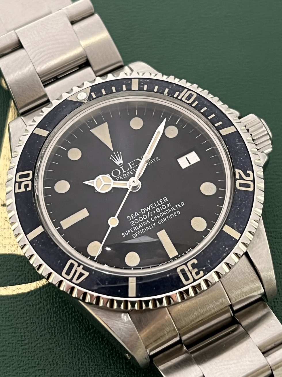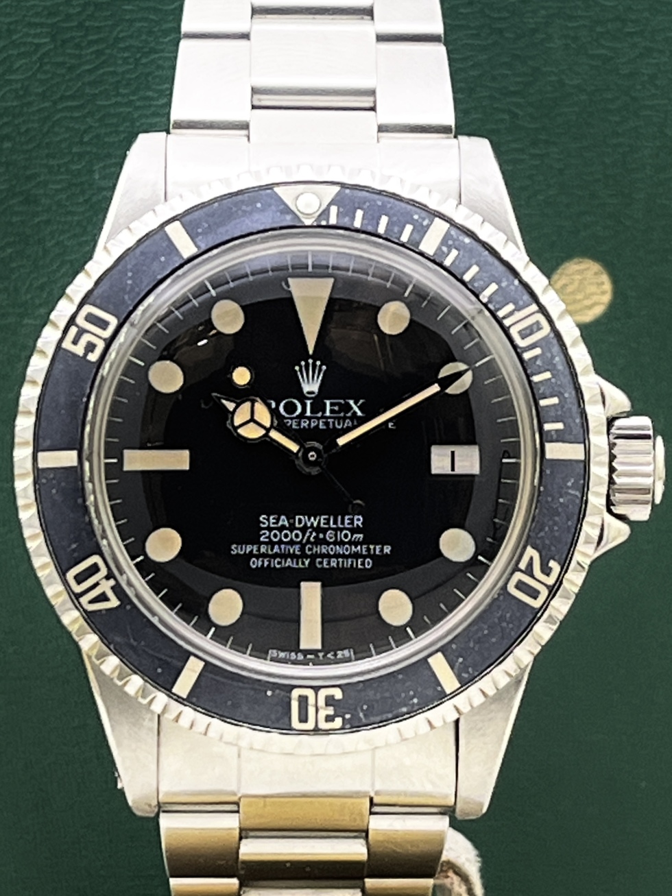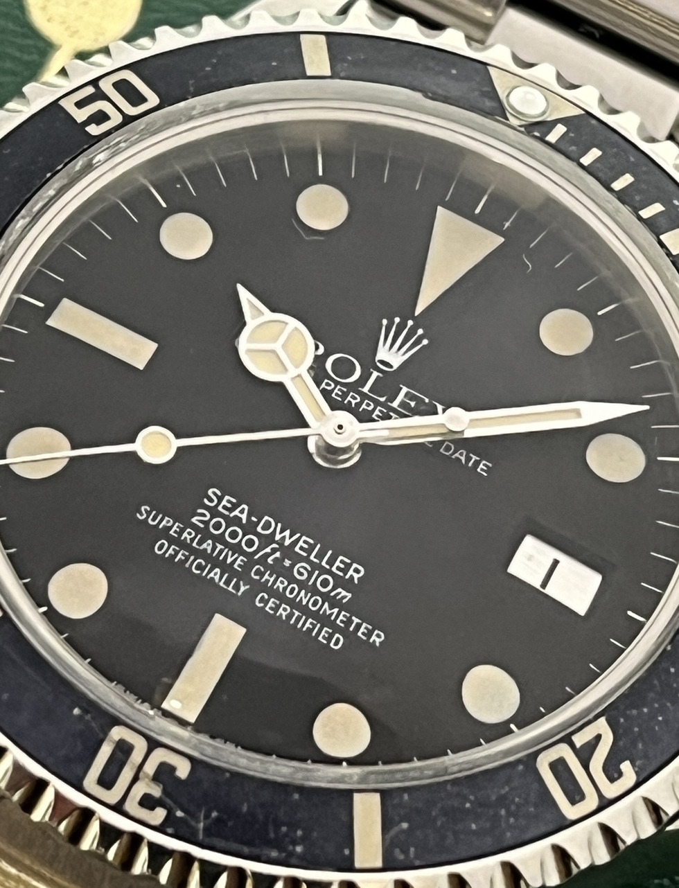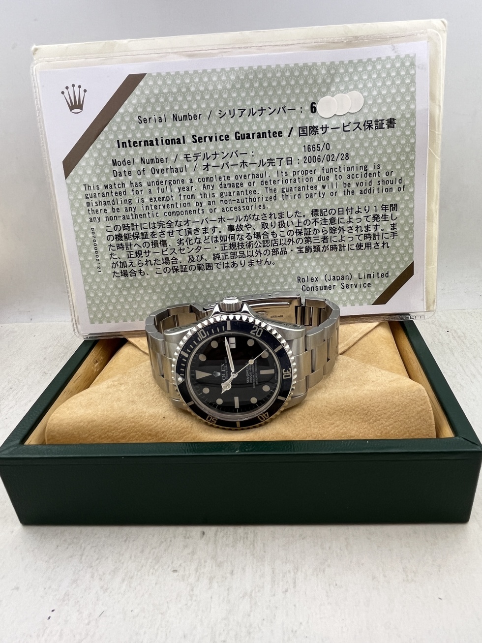 | 白シードエラーの登場です。 良好な個体が少なくなった印象です。 79年式で文字盤はMK-3 Dialとなります。 キズや剥がれもなく申し分の無いコンディションです。 程良くクリームに色付いた夜光は雰囲気も良く針共に光りません。 ケースコンディションはラグもしっかり太く良好で裏蓋のROLEX刻印もオリジナルサークルロゴとなります。 ベゼルは多少傷も見受けられるもののナイスなフェードの太字MK-3を装備し雰囲気も抜群です。 ブレスレットも当時のVB刻印Ref.93150FF580が装備されており伸びも少なく良好です。 雰囲気の良い初期Ref.1665白シード MK-3 Dial 日本ROLEX正規OH済国保カードも付属ですのでご安心頂けるかと思います。 是非この機会に如何でしょうか? |