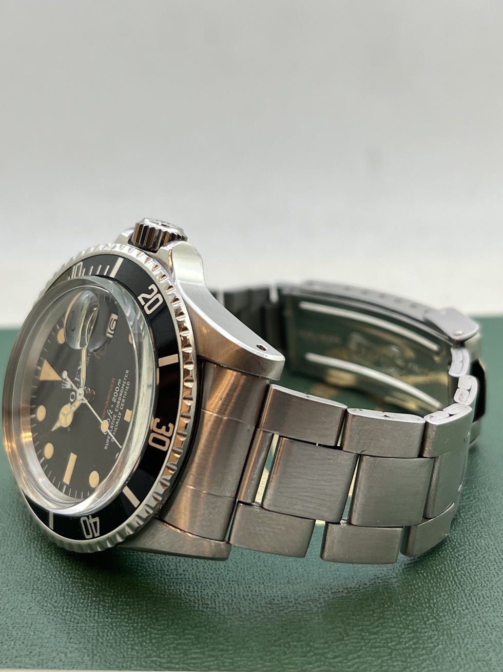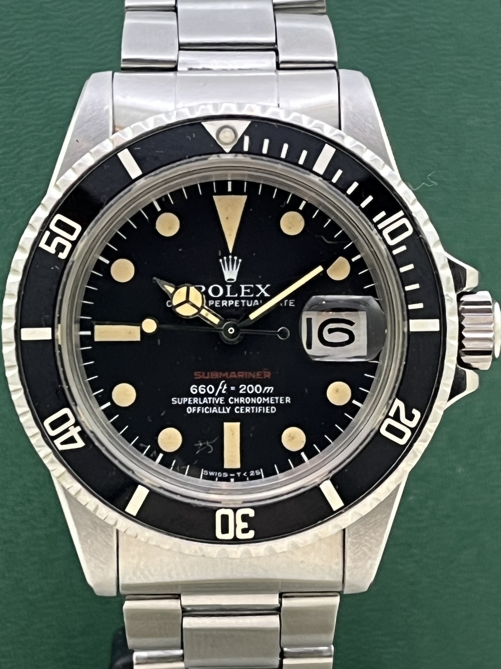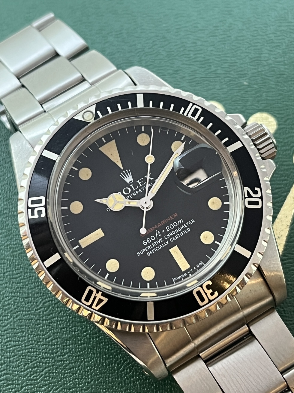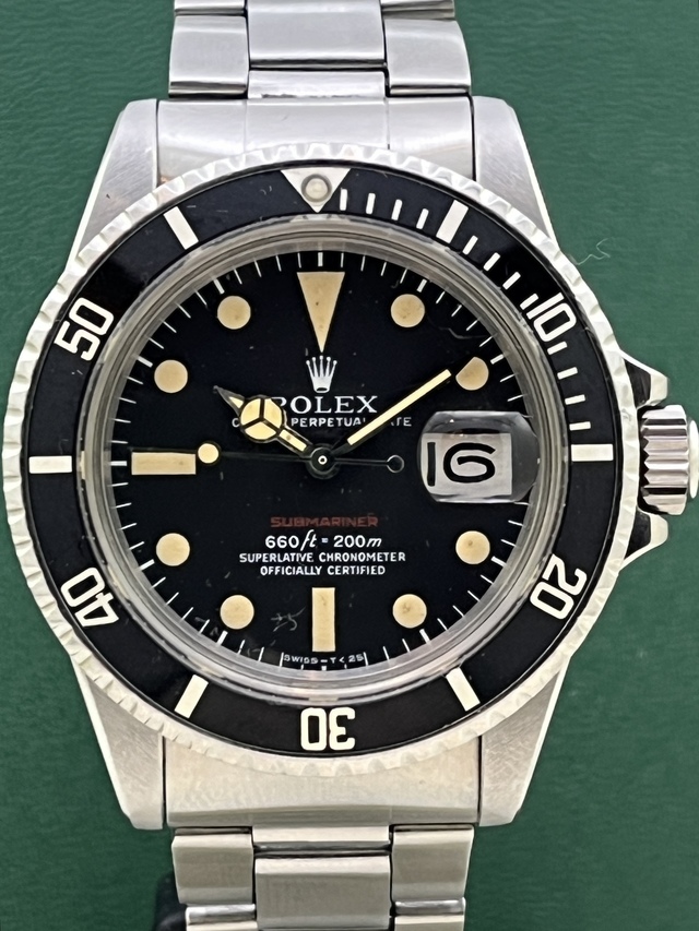 | SUBMARINER Ref.1680 赤サブの登場です。 73年頃製造の赤SUB MK-5 660ft-200m SingleRed となります。 文字盤は夜光ジミも見受けられずコンディション良好です。 夜光は自然に色付いたクリーム色で針もほぼ同色です。 ケースはかなりラグも太くグラマラスなラインを留めており良好なコンディションです。 ベゼルは当時の太字ベゼルをキープしております。 swissロールブレスRef.9315FF380を装備し,多少の伸びも見受けられますがまだまだお使い頂ける状態です。 かなりオリジナリティーを残した貴重で魅力的な MK-5シングルレッドダイアル!! 是非この機会にコレクションに加えてみてはいかがでしょうか? |