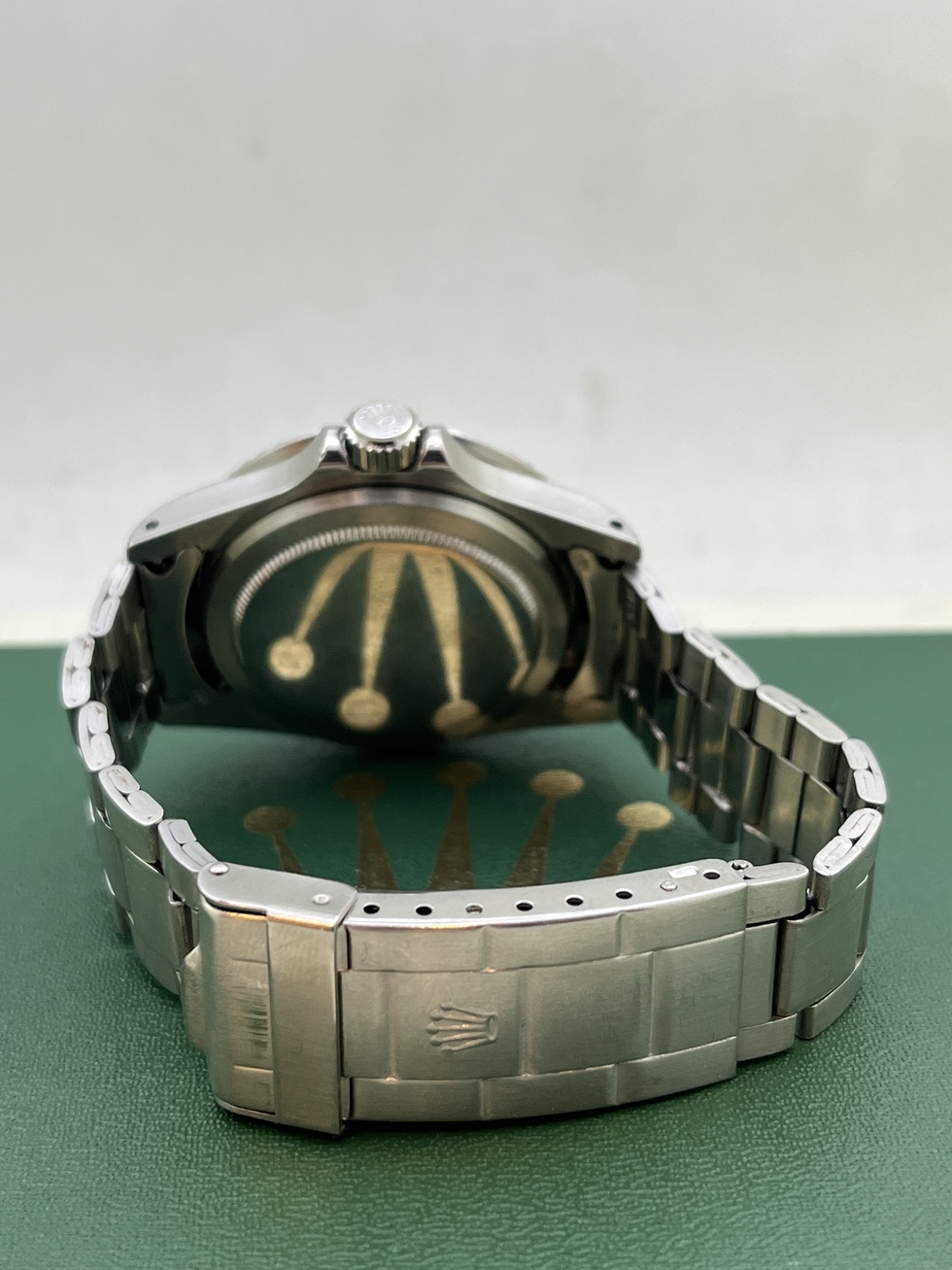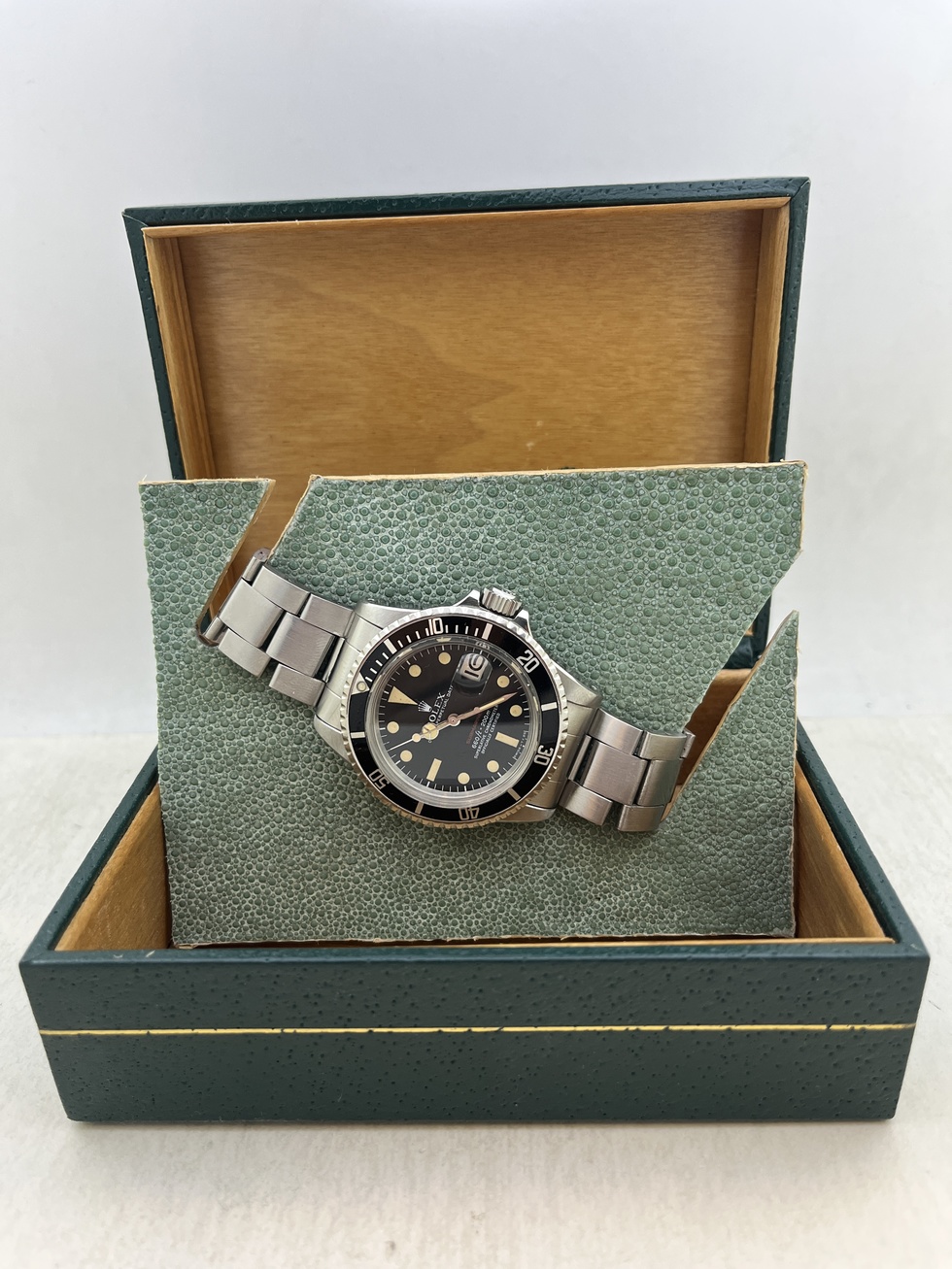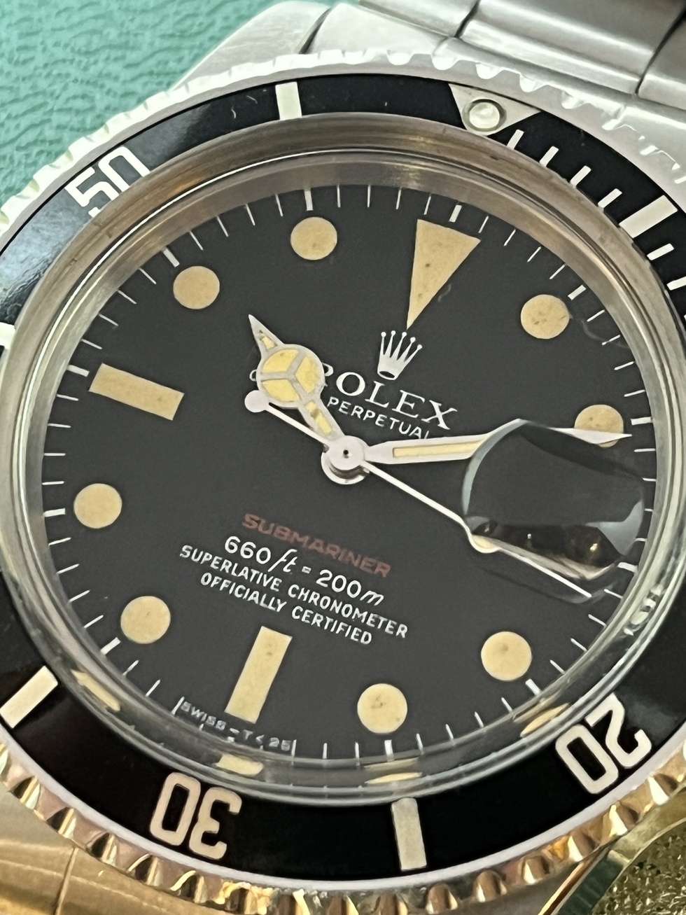 | SUBMARINER Ref.1680 赤サブの登場です。 73年頃製造の赤SUB MK-5 660ft-200m SingleRed となります。 文字盤は夜光ジミも見受けられずコンディション良好です。 夜光は自然に色付いたクリーム色で針もほぼ同色です。 ケースはかなりラグも太くグラマラスなラインを留めており良好なコンディションです。 ベゼルは当時の太字ベゼルをキープしております。 swissロールブレスRef.9315FF380を装備し,多少の伸びも見受けられますがまだまだお使い頂ける状態です。 かなりオリジナリティーを残した貴重で魅力的な MK-5シングルレッドダイアル!! 是非この機会にコレクションに加えてみてはいかがでしょうか? |