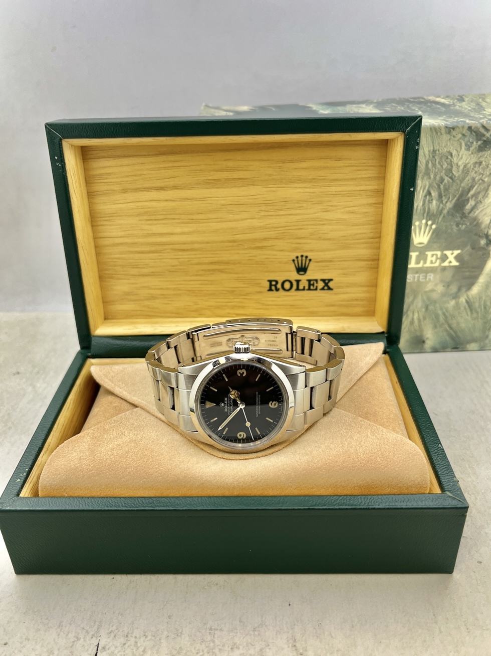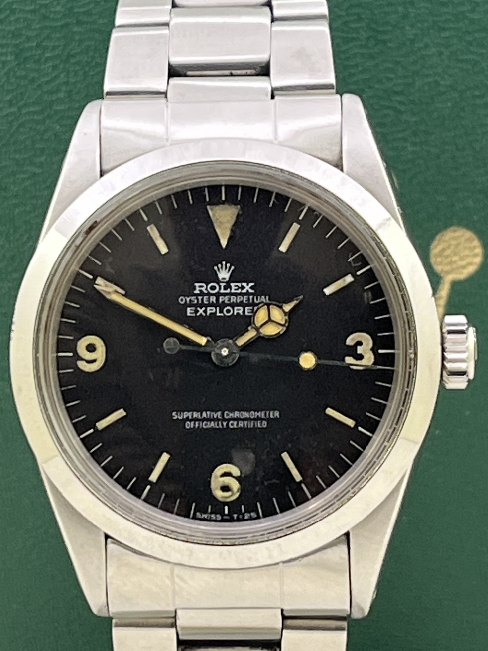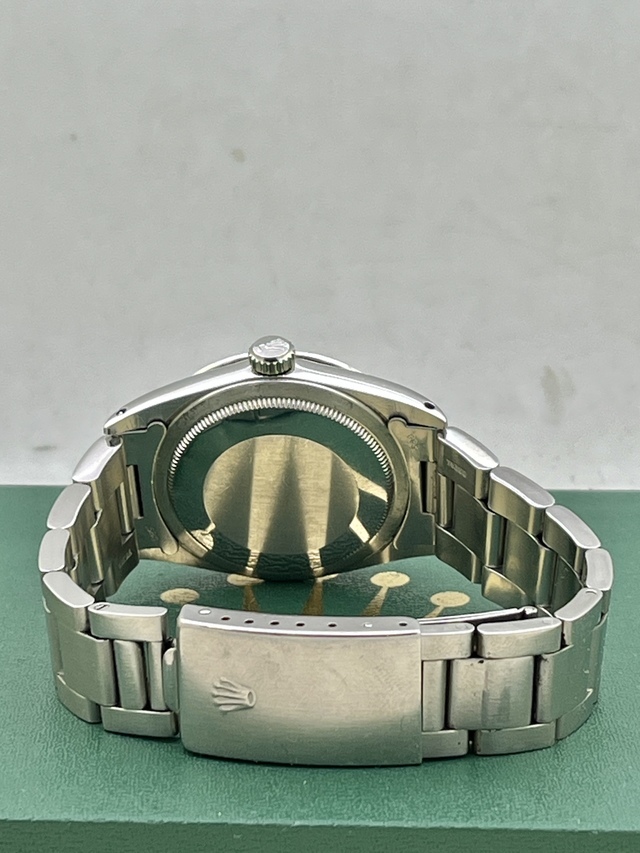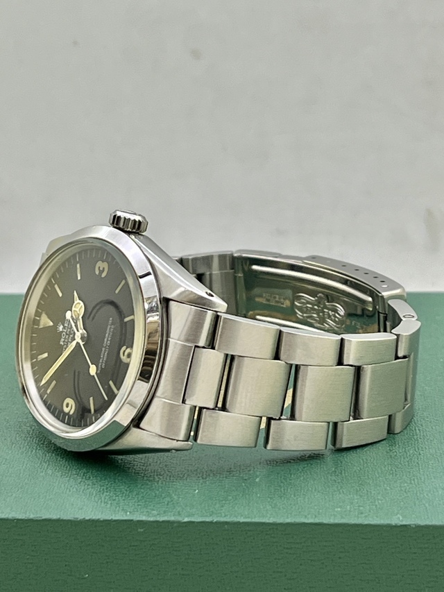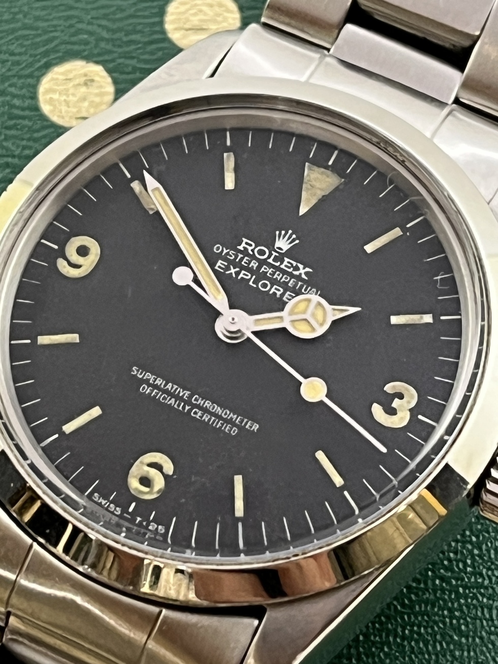 | EXPLORER-1 Ref.1016 MK-1Dialの登場です。 コンディション良好です。 人気のMK-1=Flog Foot Dial で多少の夜光汚れはございますが文字盤は全体的に傷など無い状態です。 文字盤夜光はグリーンにトリチウム反応し針夜光は光りません。 ブレスレットはスイスハードRef.78360FF580 を装備し伸びも少なく良好です。 EXPLOERE-1 Ref.1016は物凄い人気となっておりますので今後が楽しみな一本と言えるでしょう。 是非、お探しの方この機会をお見逃しなく!! |